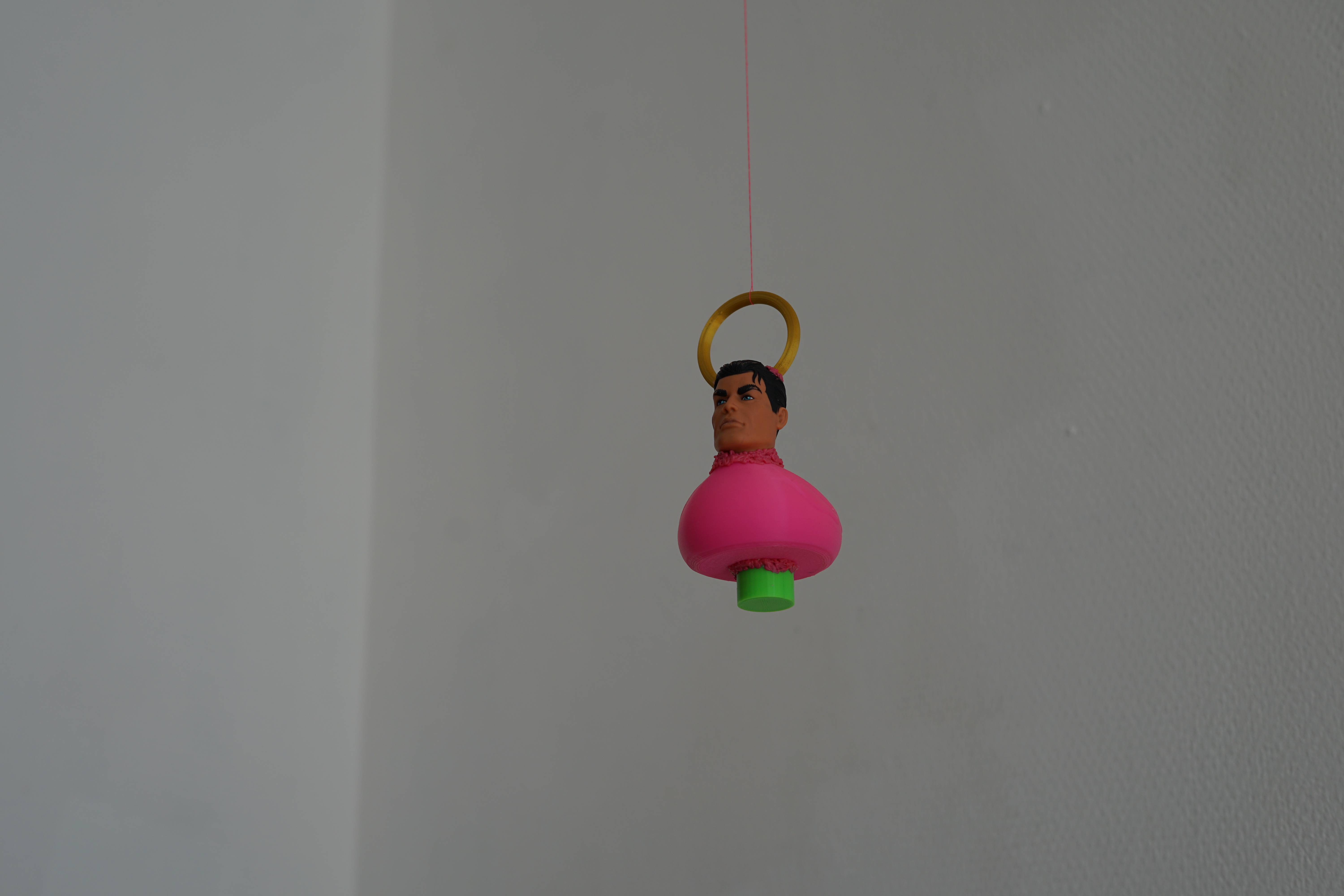 Avec La Pêche au Connards, je transforme le rapport proie/prédateur. Les prédateurs (prédateurs sexuels ou chasseurs) deviennent les proies. J’ai choisi la figure de l’Action Man pour le machisme qu’il incarne. Leur tête est posée sur un corps de canard, au bout d’un fil de pèche, et c’est une grande satisfaction pour moi de mettre à mal cette figure patriarcale.