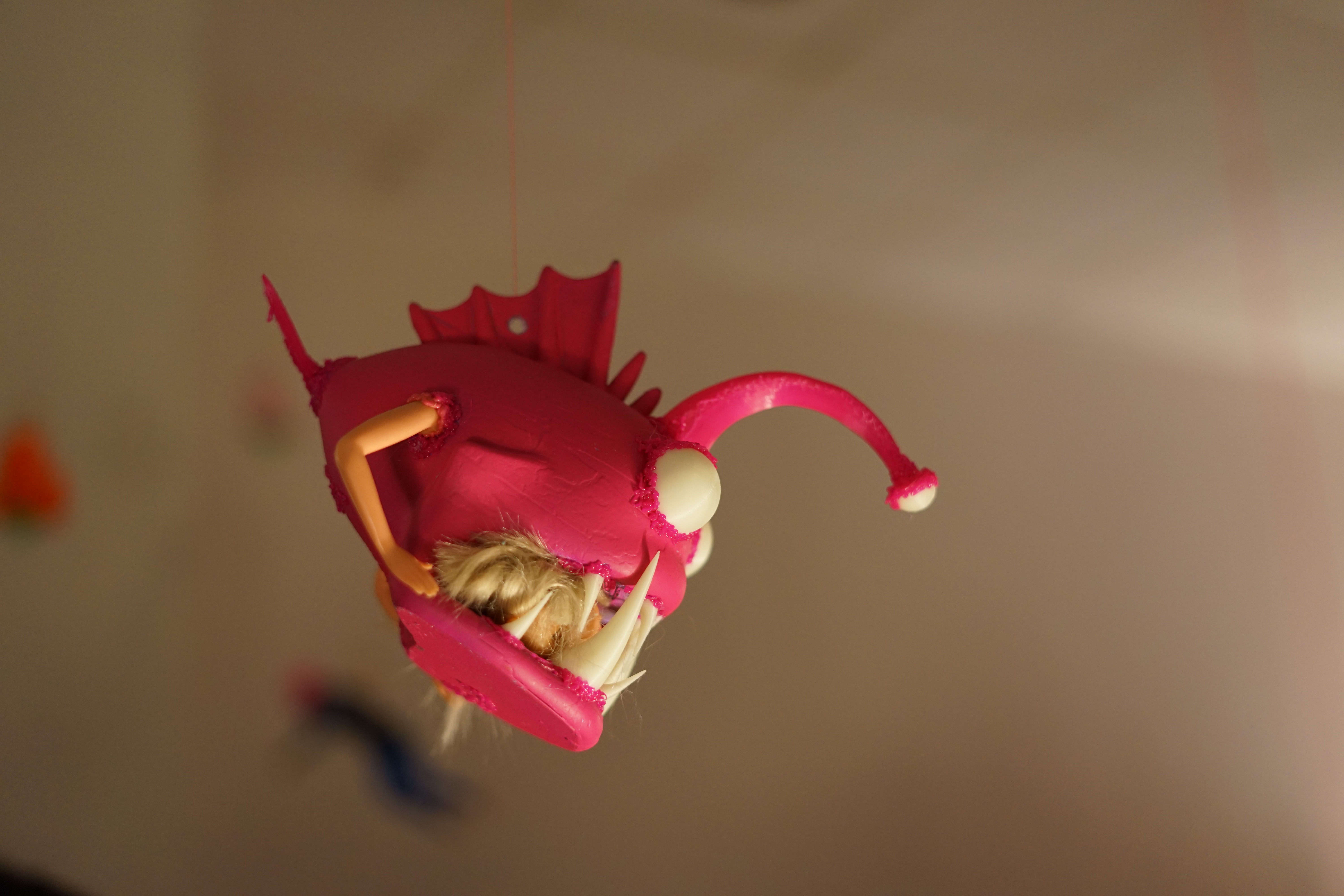 “La Pêche aux Connards est une installation que m’a inspiré l’un des objets de la collection MUSOGYNIE. En découvrant le musée d’objets misogynes, j’ai directement été interpelé·e par le calendrier Carponizer de 2018 : un calendrier qui met en scène des femmes (cis, blanches, minces…) avec des carpes hors de l’eau entrain de suffoquer. Un condensé de mauvais goût, de sexisme et de spécisme qui m’a énormément inspiré·e.